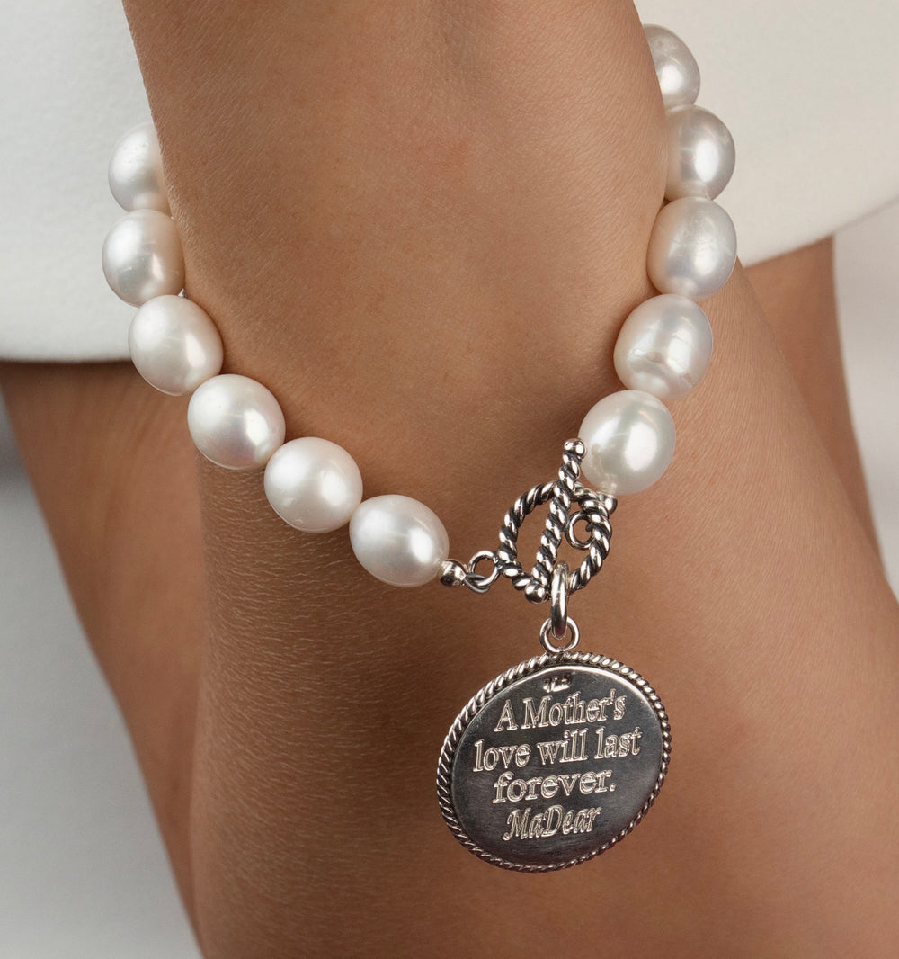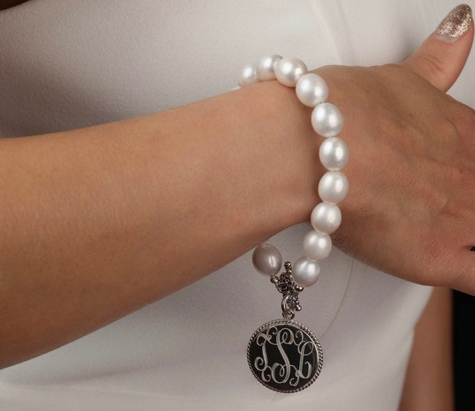 This lovely bracelet is made with freshwater pearls. The sterling silver rope trimmed medallion can be engraved with your monogram or sorority.